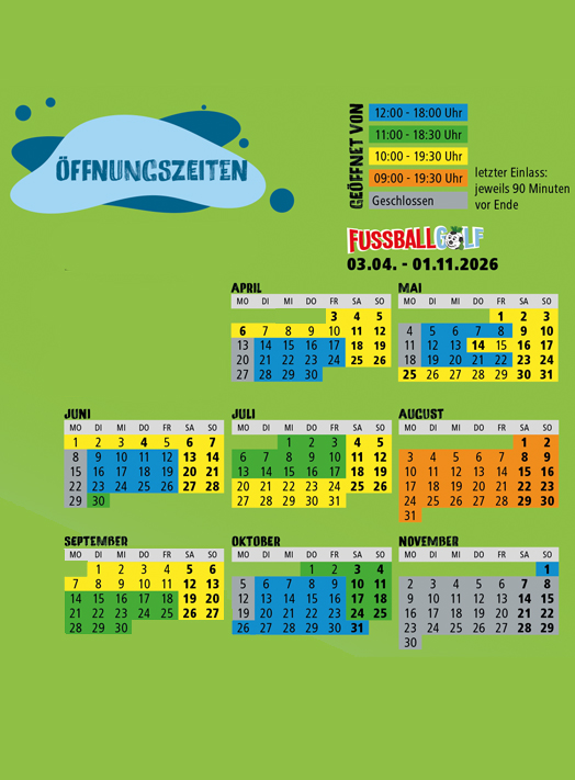 Letzter Einlass 90 Minuten vor Schließung der Anlage.